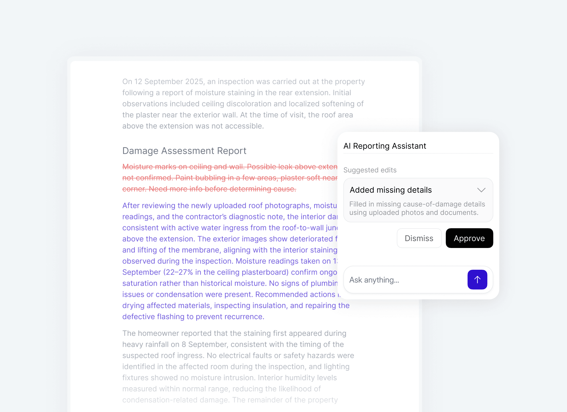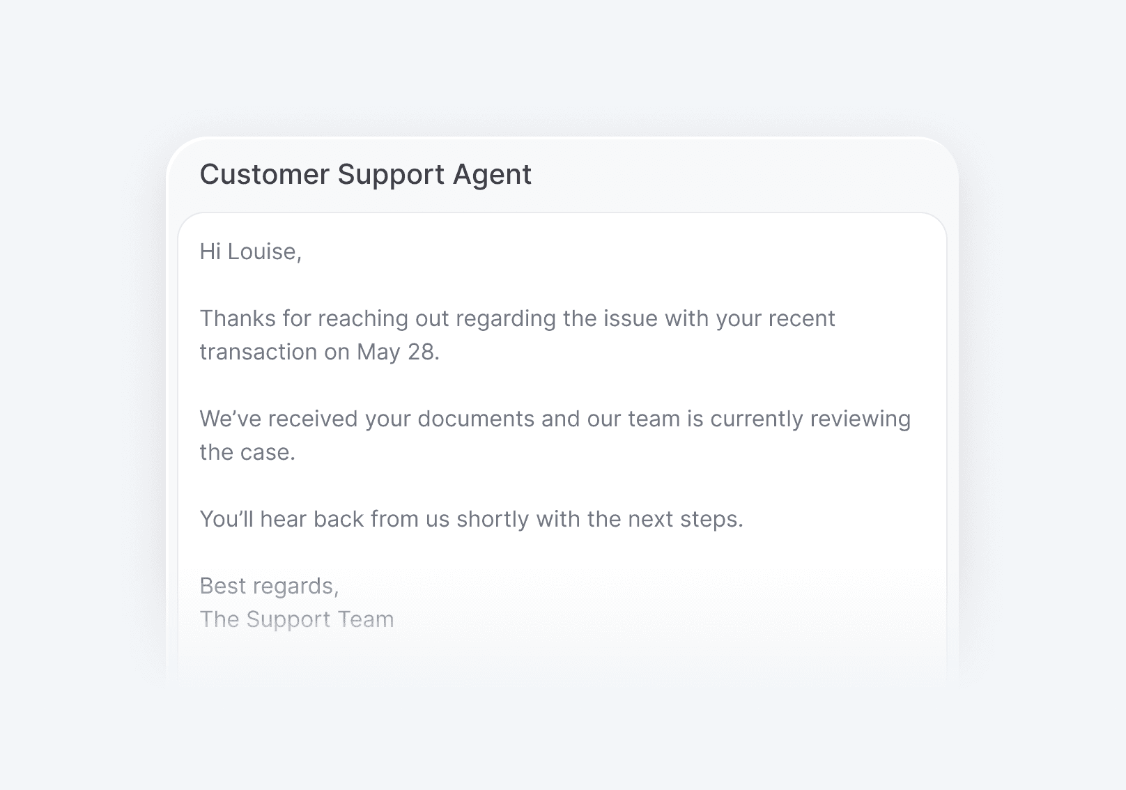 Generate immediate responses inside your platform messaging UI: claim confirmations, required documents, timelines, and next steps, improving customer trust and reducing churn.