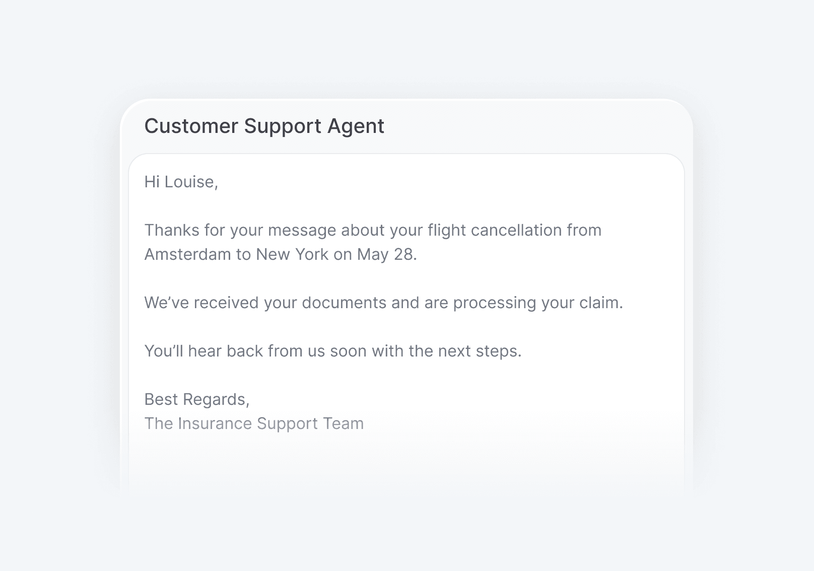 Generate consistent, compliant updates across all channels; claim status, missing documents, coverage explanations.